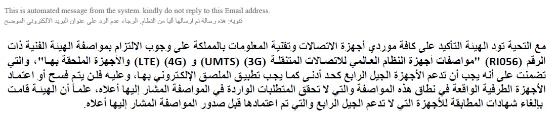 On March 21, 2019 Saudi Arabia Telecommunication Authority (CITC) has sent to all customers the following information (in Arabic).