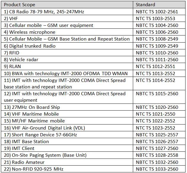 On March 14, 2019, the National Broadcasting and Telecommunications Commission of Thailand (NBTC) has released the following standards: